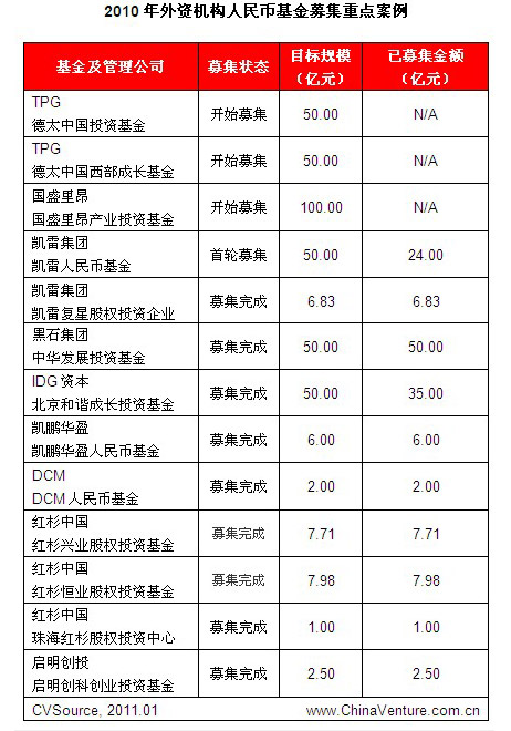 表1 2010年外资机构人民币基金募集重点案例