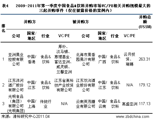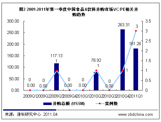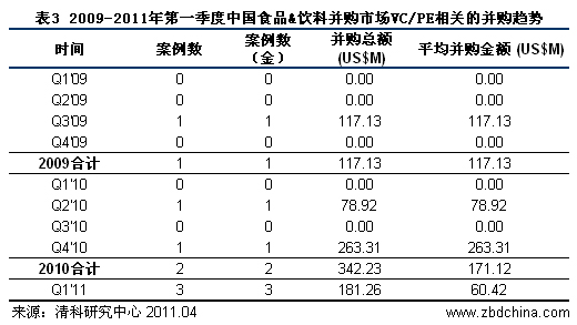在清科研究中心研究范围内,从2009年到2011年第一季度,中国食品&饮料并购市场共完成6起VC/PE相关的并购案例,其中披露具体金额的并购案例共有6起,并购总额为6.41亿美元。2009年和2010年分别发生1起和2起案例,并购总额分别为1.17亿美元和3.42亿美元。2011年第一季度VC/PE相关并购突破了历史新高,仅三个月就完成3起案例,披露价格的并购有3起,并购总金额为1.81亿美元,平均并购金额为6,041.84万美元。