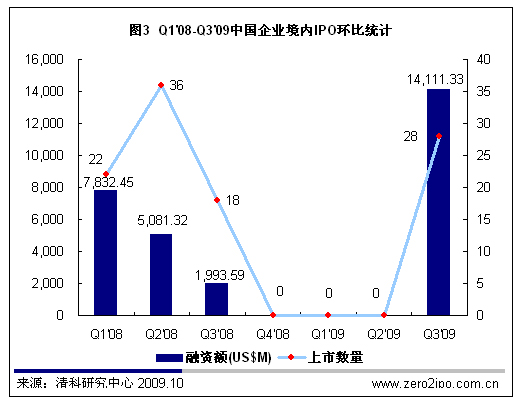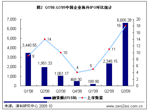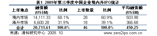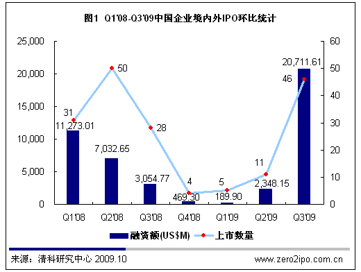 大中华区著名创业投资与私募股权研究、顾问及投资机构清科集团近日发布的《2009年第三季度中国企业上市研究报告》显示:在清科研究中心关注的境外13个市场和境内2个市场上,2009年第三季度共有46家中国企业上市,合计融资207.12亿美元,平均每家企业融资4.50亿美元。在海外资本市场持续走暖、境内A股IPO重启的背景下,第三季度中国企业境内外上市放量,上市数量和融资额上升到2008年以来的高位。其中,上市企业数量仅低于2008年一季度水平,较2008年同期增加18家,较上季度增加35家;融资额则创下2008年以来新高,较2008年同期增加5.78倍,较上季度增加7.82倍。(见图1)
