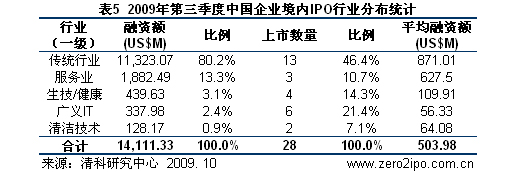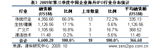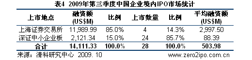 三季度,境内上市企业仍以中小企业为主。在境内上市的28家上市企业中,除在上海证券交易所上市的4家企业外,其余24家企业均在深圳中小企业板上市,合计融资21.21亿美元,平均每家上市企业仅融资8,838.92万美元。(见表4)