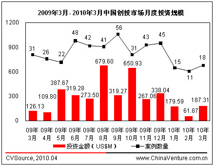 根据ChinaVenture投中集团旗下数据产品CVSource统计显示,仅2010年3月获投资中国企业就达18家之多,融资金额达1.87亿美元。