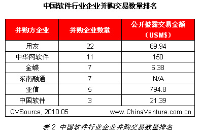 在软件行业展开并购交易较为活跃的企业包括用友软件(600588.SH)、中华网软件(CDC.NASDAQ)、金蝶国际(268.HK)等,拥有大量现金和提升业绩动力的上市公司成为软件行业并购的主要参与者(见表2)。
