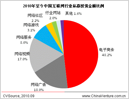 ChinaVenture投中集团旗下数据库产品CVSource统计显示,2010年1-8月份,互联网行业披露融资案例数量70起,融资金额7.06亿美元,分别达2009年全年案例数量及金额的82.4%和92.3%。其中电子商务行业披露融资案例33起,融资金额3.38亿美元,融资金额在互联网领域占比达48.2%,达到电子商务行业年度历史最高水平。