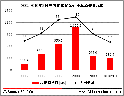 图为2005-2010年9月中国传媒娱乐行业私募投资规模
