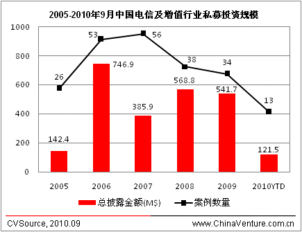 图为2005-2010年9月中国电信及增值行业私募投资规模