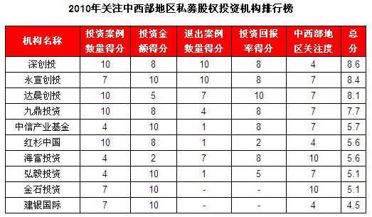 2010关注中西部创投机构排行榜