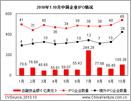 ChinaVenture 投中集团旗下数据库产品CVSource统计显示,2010年10月共有49家中国企业登陆全球资本市场,融资总额达105.38亿美元;IPO企业数量达今年月度最高水平,融资金额则仅次于7月份--中国农业银行于7月份在上交所和港交所同时上市,融资超过200亿美元,除去该特殊因素,10月份IPO融资金额也将达今年最高水平。此外,本月境外IPO企业数量也创造今年最高纪录,企业数量为28家,远超其他几个月份,其占本月IPO总量的比例也达到57.1%(见图1)。